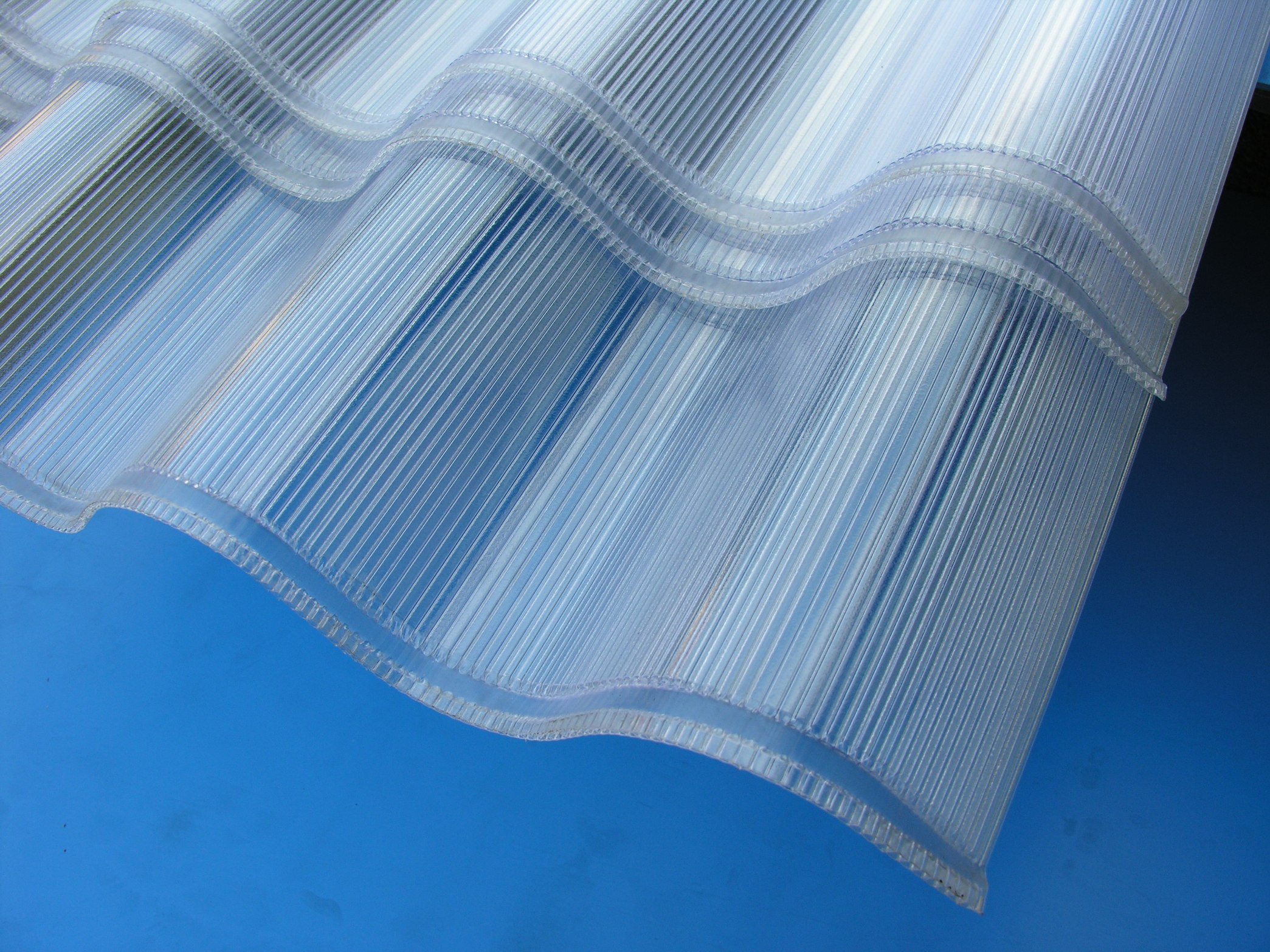 Večslojna polikarbonatna valovita plošča,veliki val, prozorne barve in debeline 4 mm z enostransko UV zaščito